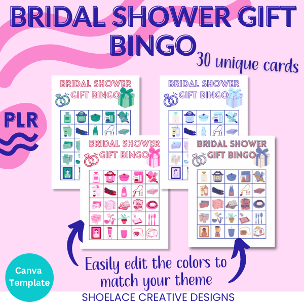 Bridal Shower Gift Bingo: 30 different Bingo cards contain images of common bridal shower/wedding gifts. The color palette can easily be changed in Canva- offer custom Bingo cards to match the bride's theme!